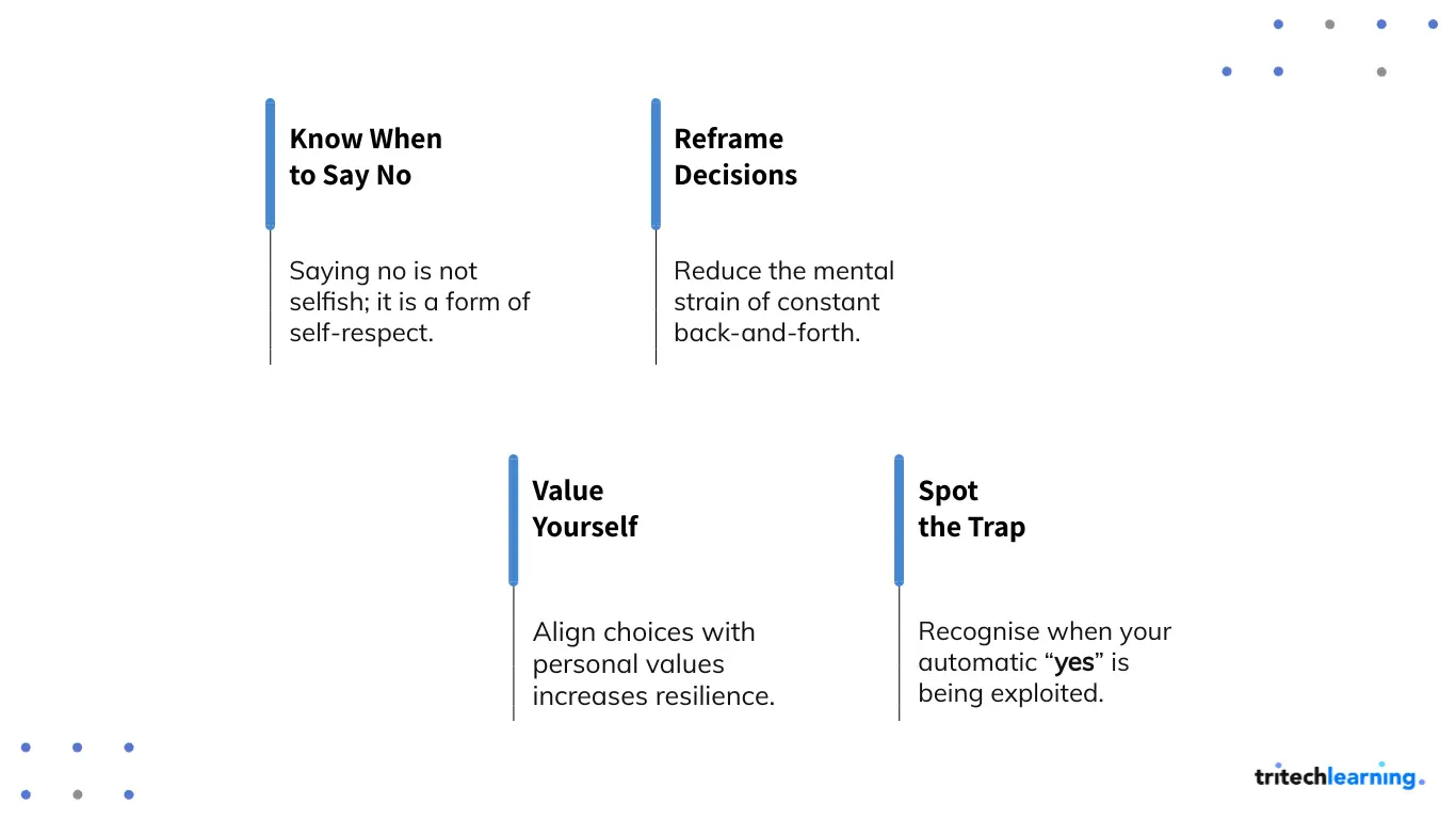 Spotting the trap is another important step. In many workplaces, people quickly learn who the reliable “yes person” is, and they often lean on that predictability. Becoming aware of this pattern is powerful. Research on self-awareness shows that increasing it can significantly reduce perceived stress (Eurich, 2018). Simply recognizing when your automatic “yes” is being exploited allows you to make more conscious decisions about when to help and when to step back.